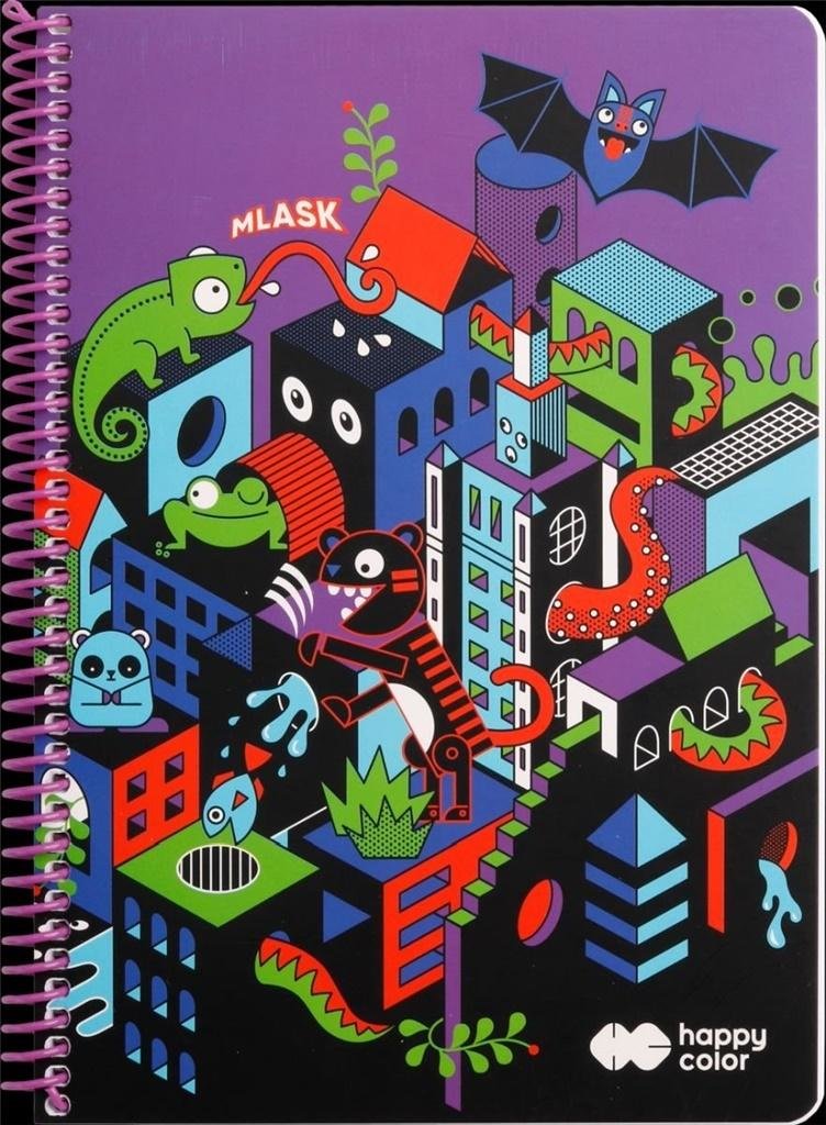 Design kolekcji Me&City, przedstawiającej surrealistyczny miejski gąszcz przygód różnych niebanalnych postaci. Sztywna okładka. Spirala dopasowana kolorystycznie do designu okładki. Biały papier 80g w szarą kratkę. 80 kartek. Format: B5 przeczytaj całość