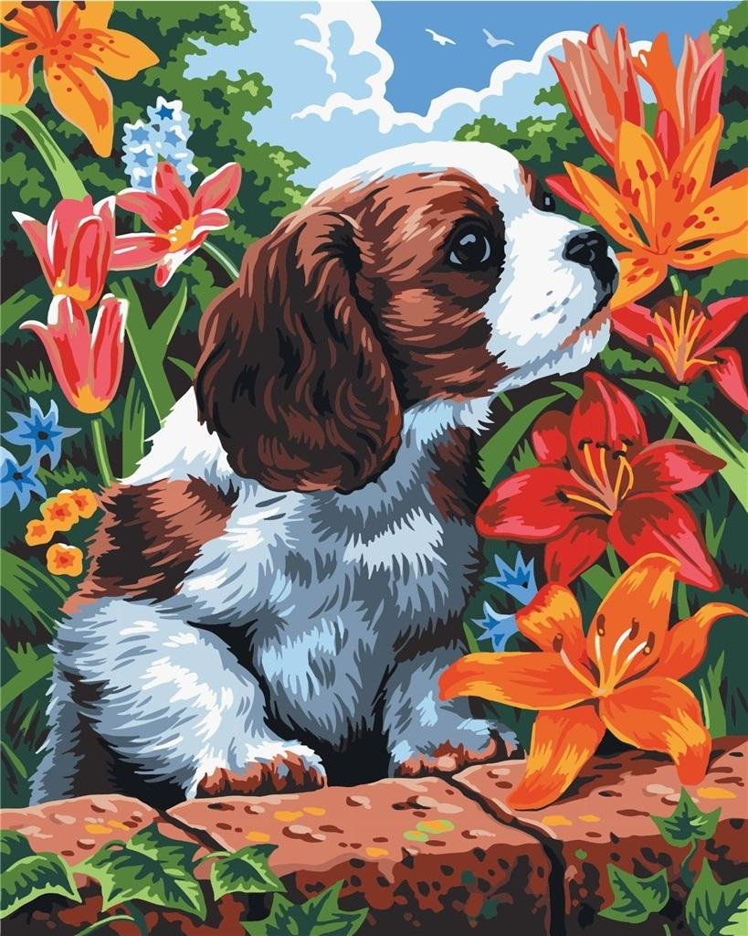 Malowanie po numerach - Pies w kwiatach 40x50cm