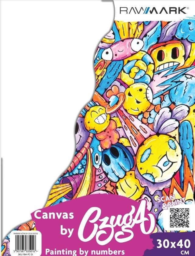 Zestaw zawiera płótno naciągnięte na drewnianą rame z nadrukiem w stylu doodle.. Wzór stworzony przez znanego influencera Czuga. Produkt kompatybilny z zestawem markerów Rawmark PurePro 80szt, wspierany kampanią reklamową. Skanuj i maluj po numerach! przeczytaj całość