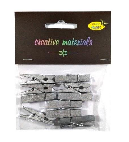 Małe kolorowe, drewniane klamerki ozdobne wielkości 35 mm pakowane w opakowanie z eurozawieszką. Opakowanie zawiera 10 sztuk klamerek w kolorze srebrnym. przeczytaj całość