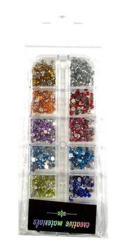 Kryształki z płaskim spodem wykonane z przezroczystego tworzywa sztucznego w kształcie kolistym. Spód srebrny metalizowany. Opakowanie z eurozawieszką zawiera miks elementów wielkości 4 mm w 12 różnych kolorach umieszczone w plastikowym pojemniku z 12 przegródkami. przeczytaj całość