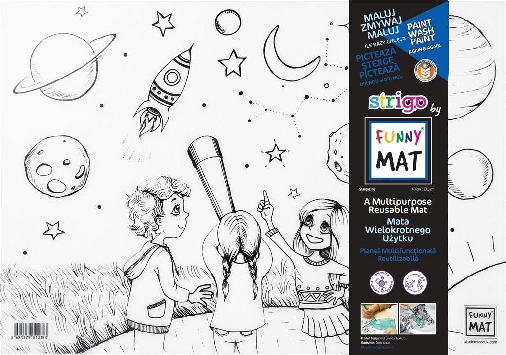 Mata transparentna Obserwacja nieba Funny Mat 48x33,5cmWodoodporna mata wielokrotnego użytku do rysowania, malowania i nauki. Idealny produkt do rozwijania wyobraźni, pobudzenia kreatywności, pełni też funkcje edukacyjne. Do wykorzystywania maty używaj flamastrów, które posiadają tusz na bazie...