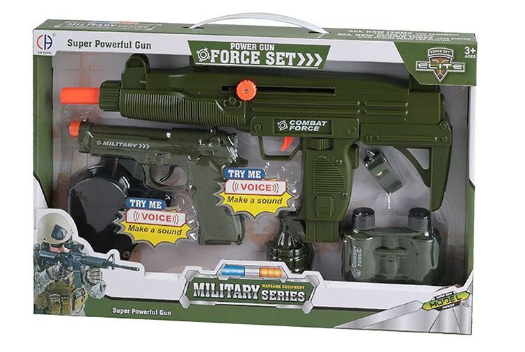 Funkcje: Karabinek: po naciągnięciu przegrody pocisku i naciśnięciu spustu słychać dźwięk imitujący wystrzały z broni automatycznej Pistolet: po naciśnięciu spustu słychać dźwięk imitujący wystrzał przeczytaj całość