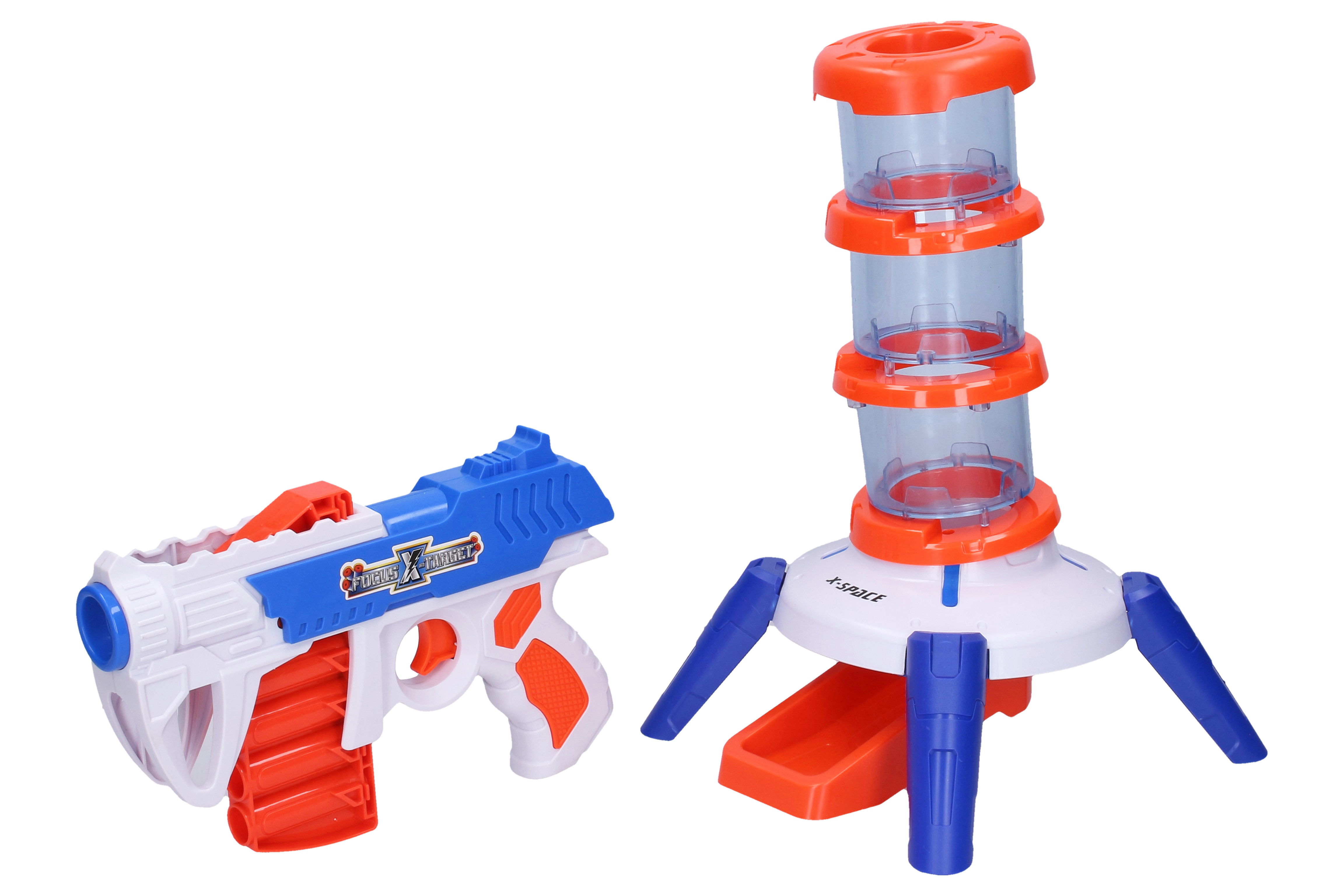 Pistole na pěnové náboje věž s terči. Rozměry 33,5 x 19,5 cm. Návod na složení věže na obalu. Posuvný vertikální zásobník na 6 nábojů. 12 nábojů v balení. przeczytaj całość
