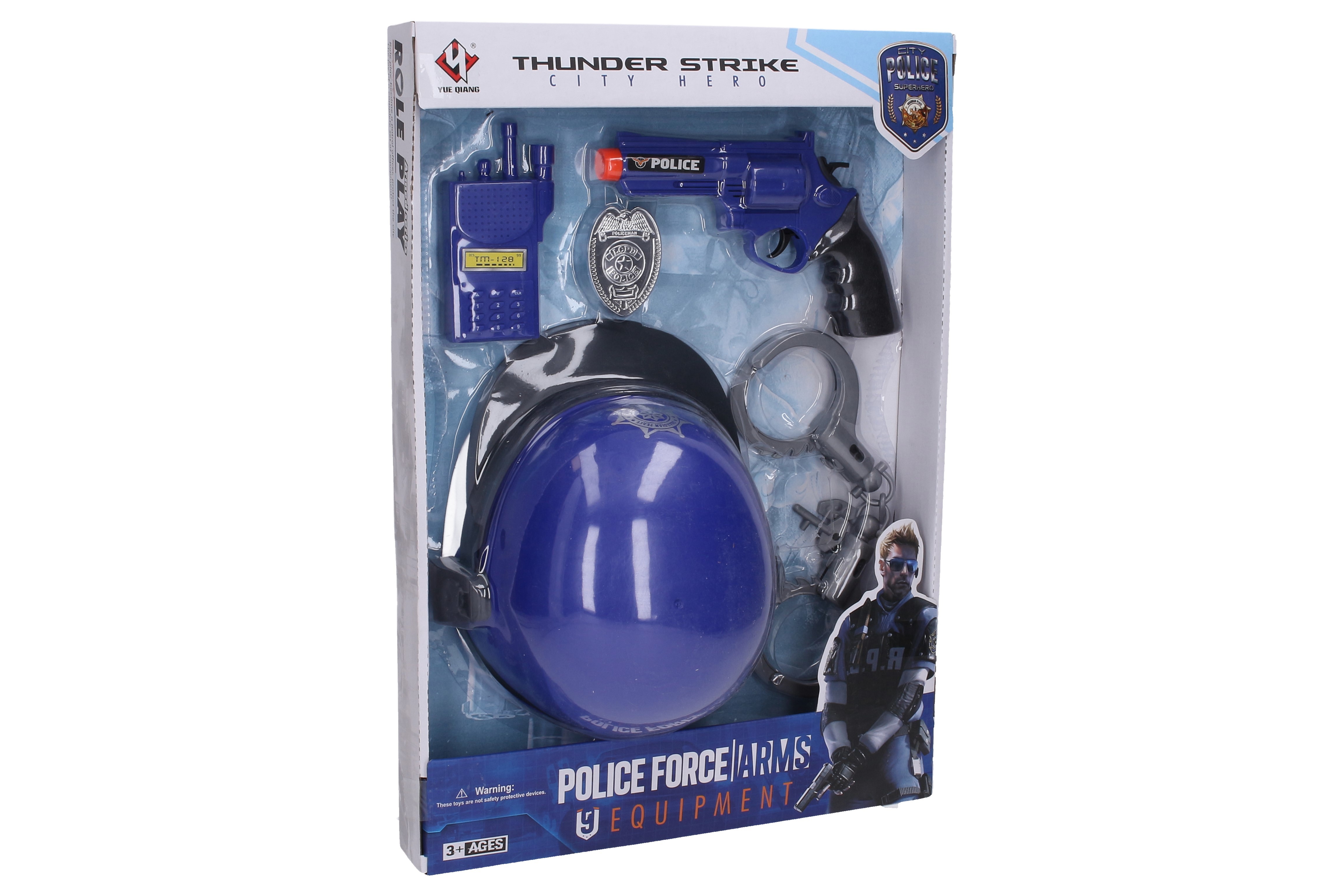 Policejní sada s přilbou 26 x 22 cm. Obsah balení - pistole 20cm (akustické zvukové efekty), policejní odznak, vysílačka, pouta s klíčem, přilba 26x22 cm. przeczytaj całość