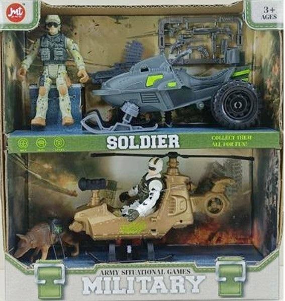 Zestaw wojskowy dla chłopców. W opakowaniu: helikopter, skuter śnieżny, broń, figurki żołnierzy i figurka pieska. Produkt zapakowany w kartonowe opakowanie z przezroczystym okienkiem. Zabawka dla dzieci od 3 lat. Podane wymiary są wymiarami opakowania. przeczytaj całość
