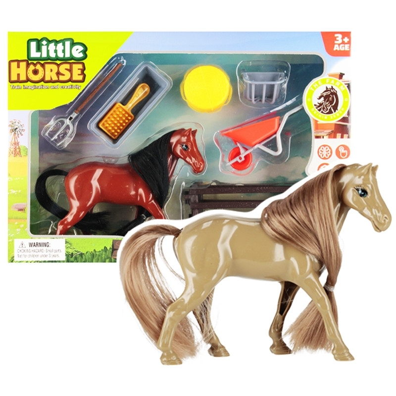 Koník s příslušenstvím sada, má rozměry 27X18X5 cm. Na výběr ze dvou variant. Obsah sady je Kůň, 1x kartáč, 1x vidlička, 1x balík sena, 1x košík, 1x kolečka, 1x ohrádka. Cena je za 1 sadu. Vhodné pro děti 3+. przeczytaj całość