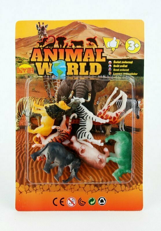 Zestaw małych figurek (dzikie zwierzęta). Żywa kolorystyka przyciąga uwagę nie tylko dzieci, ale i dorosłych. Poszczególne elementy odznaczają się dość realistycznym kształtem. Zabawka jest idealna, by odwzorowywać życie sawanny. Wszystkie elementy są umieszczone na blistrze z zawieszką.W komplecie:- zebra,- żyrafa,- tygrys,- nosorożec,- lew,- krokodyl,- słoń,- hipopotam.Wymiary (1szt.): 14x3x21cmWiek: 3+