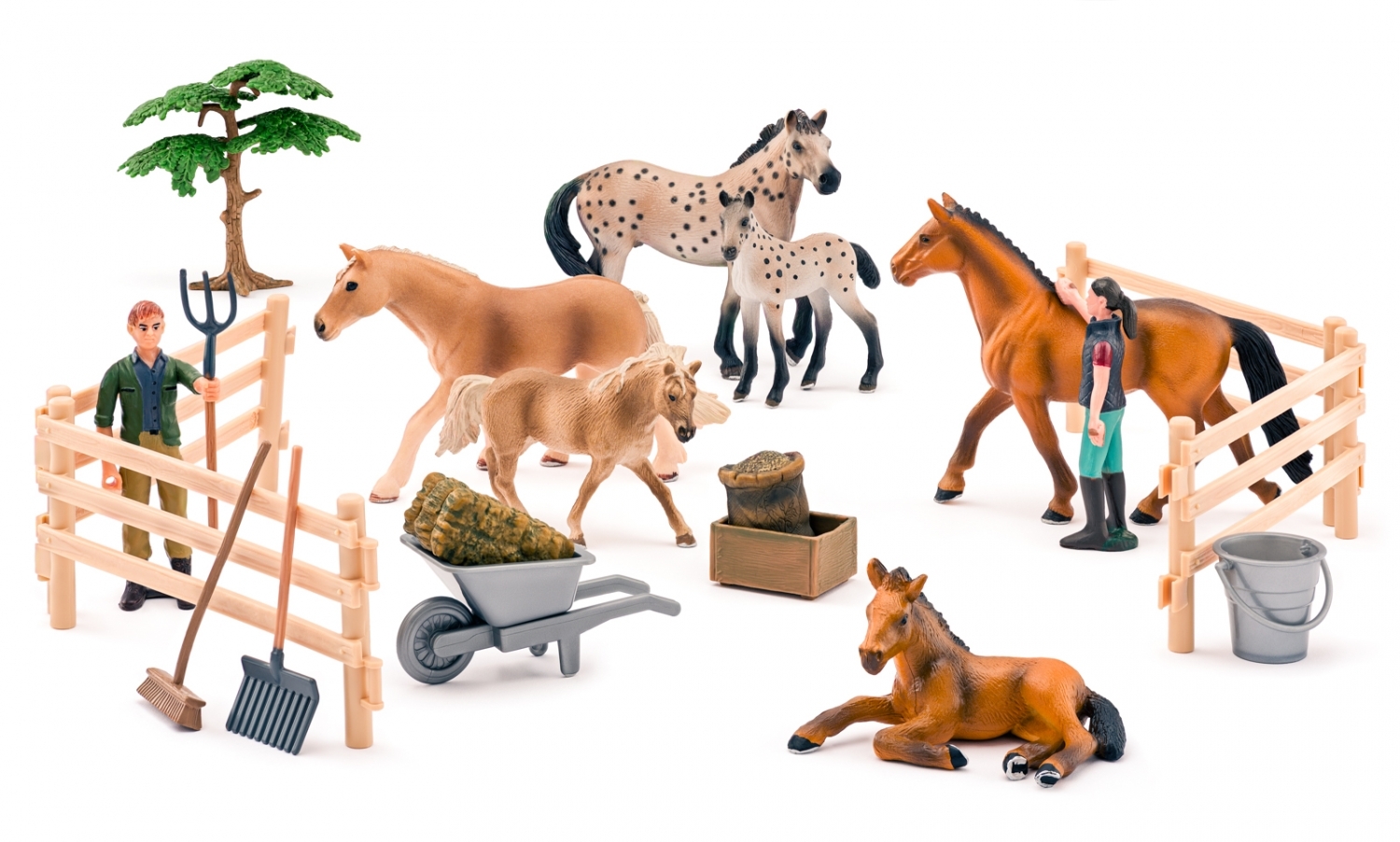 Piękny zestaw do zabawy, który naprawdę jest pełen koni Znajdziesz w nim 3 dorosłe konie i 3 źrebięta, 2 opiekunów oraz mnóstwo dodatkowych akcesoriów. Liczba figurek: 8 Liczba elementów: 25 Wiek: 3 Wielkość konia: 12 x 10 cm przeczytaj całość