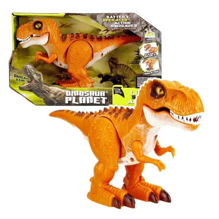 Má světelné a zvukové efekty, pohybové efekty: chodí a otevírá ústa, oči září žlutě, vydává zvuky řevu a šlapání po zemi, rozvíjí fantazii dítěte, RRRR !!! Hračka vyrobená z plastu. Rozměry: rozměry produktu (D x V x H) [cm]: 31x18x8, rozměry balení (D x V x H) [cm]: 34x21x10, vyžaduje 2 x AALR03...