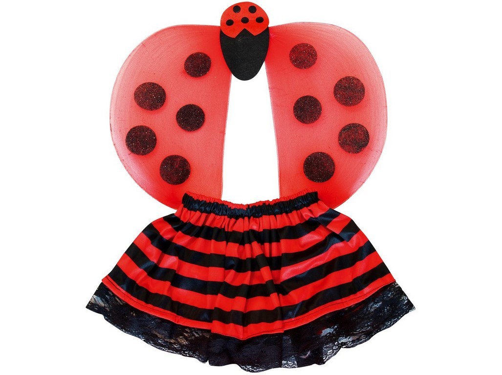 Karnevalový kostým - Beruška.Velikost: Pro malé děti (3-5 let).Délka sukýnky: cca 23 cm.Nejoblíbenější kostým krásné berušky v červeno-černém provedení.Sukýnka je proužkovaná a křídla jsou oživena černými puntíky. Balení obsahuje:- sukýnku s proužky- křídla- tykadla- hůlku. przeczytaj całość