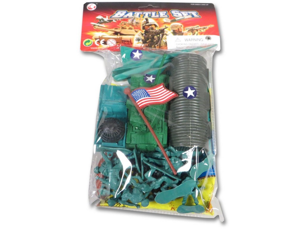 Figurky vojáčků s vojenskými vozidly v sáčku.Vyrobeno z plastu.Hračka je vhodná pro děti od 3 let. przeczytaj całość