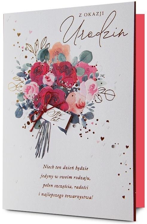 Kartka jest bogato i różnorodnie zdobiona (zależnie od wzoru: metaliczna folia, lakier perłowy, brokat, przyklejone elementy 3D - wypukłe wstawki papierowe, elementy biżuteryjne, tłoczenia).Kartka zawiera życzenia i kolorowy środek. W zestawie znajduje się koperta, kolorystycznie uzupełniająca... przeczytaj całość