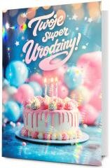 Kartka jest zdobiona opalizującą folią holograficzną, zawiera życzenia oraz kolorowy środek. W zestawie znajduje się koperta, kolorystycznie uzupełniająca się z kartką. Format złożonej kartki: B6 przeczytaj całość