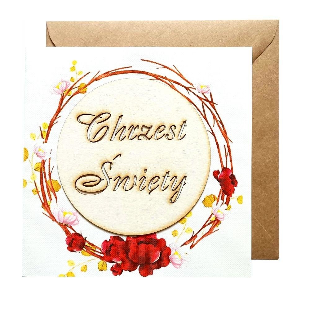 Kartka okolicznościowa z okazji Chrztu Świętego o treści: W podróży przez życie niech Cię zawsze Pan Bóg chroni i mocą Chrystusa przed pokusami obroni. Kochaj rodziców, by pociechę z Ciebie mieli, by radość w Tobie widzieli. Pamiętaj, że Bóg patrzy na Ciebie. W Dniu chrztu Świętego przeczytaj całość