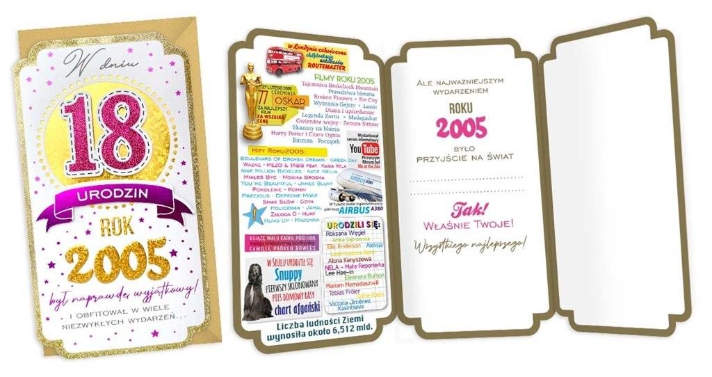 Kartki z serii Roczniki Passion Moments to zdobione kartki, w których w środku znajdują się ciekawe wydarzenia z danego roku. Na kartce znajdują się dekoracje ze złotej, srebrnej, perłowej lub holograficznej folii, a także doklejki biżuteryjne, kokardki, brokat, laserowe wycięcia, wstążeczki i...