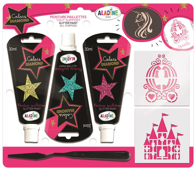 Kreativní sada s diamantovými barvami. Vyjímečně třpytivé barvy se nanáší špachtlí přes šablonu. Jsou vhodné na papír, textil, kov, i plast: jsou ideální k dekoraci přáníček, deníků, triček, tenisek, kšiltovek, ale i penálků a dalších předmětů. Sada obsahuje 3 ks barev, 2 šablony a špachtli. przeczytaj całość