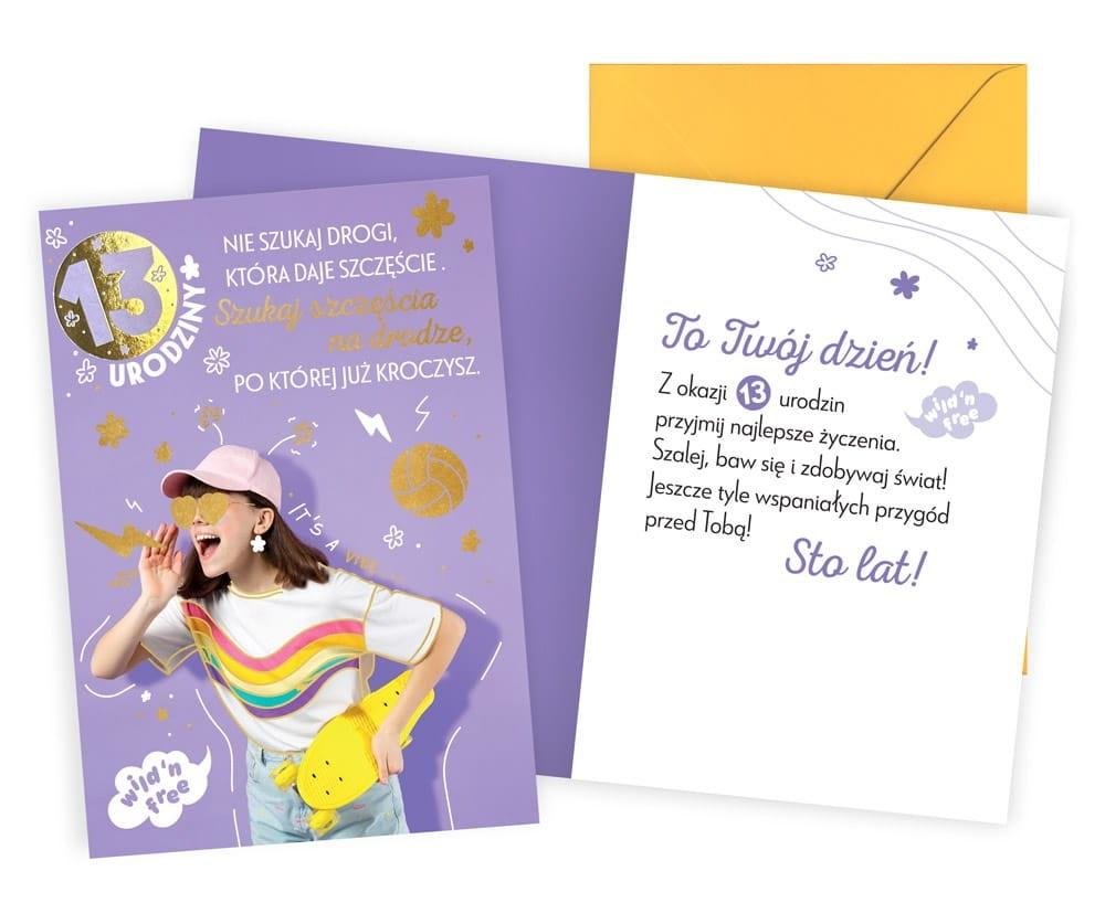 W powiększonym tzw. Angielskim formacie 140x190 mm. Wykonany z niezwykłą dbałością o szczegóły, zdobiony. Wewnątrz znajduje się tekst życzeń, a całość uzupełnia dopasowana kolorystycznie koperta. okazja: Urodziny przeczytaj całość