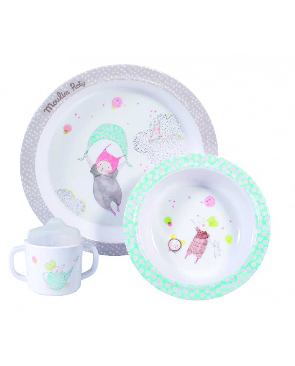 Set obsahuje talířek, misku a hrneček s pítkem. przeczytaj całość