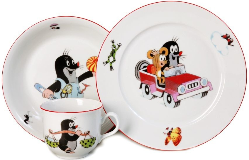 Dětská jídelní sada s krtečkem - 1x mělký talíř, 1x hluboký talíř, 1x hrneček. Nádobí je vhodné do mikrovlnné trouby i do myčky nádobí. Materiál - porcelán. Rozměry - talíř hluboký - průměr 19 cm, talíř mělký - průměr 21 cm, hrneček 200 ml. przeczytaj całość