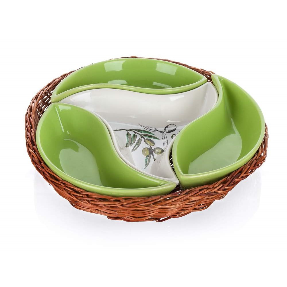 Zestaw zawiera trzy mniejsze i jedną większą ceramiczną miskę, które umieszczone są w stylowym plecionym koszyku o średnicy 21,6 cm. Każdy element zdobiony jest popularnym dekorem oliwek, co nadaje rustykalny, a jednocześnie elegancki charakter każdej kuchni czy jadalni. Zestaw jest częścią popularnej kolekcji ceramiki OLIVES, którą można wygodnie rozszerzać o kolejne elementy tego samego wzoru.