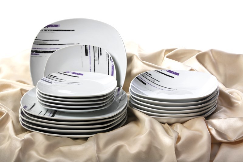 Sada obsahuje 5x mělký talíř 25 x 25 cm, 6x hluboký talíř 21.5 cm x 21.5 cm, 6x dezetní talíř 19 x 19 cm.